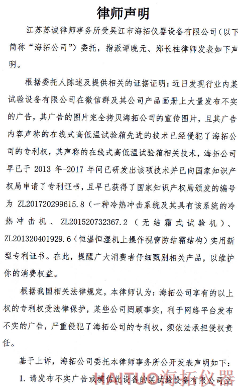 海拓儀器律師聲明:反對侵權行為 維護公司和消費者權益摘要:國內試驗設備領先者吳江市海拓儀器設備有限公司委托律師事務所發(fā)布了律師聲明,該聲明指出,當前市面上出現(xiàn)了產(chǎn)品專利侵犯海拓儀器權益,海拓儀器將以法律手段維護自身利益。該律師聲明要求某試驗設備有限公司立即停止侵權行為,扯下其在網(wǎng)絡平臺的相關廣告和宣傳畫冊并同時停止生產(chǎn)同款設備。如果該設備公司不聽勸解,海拓儀器將向人民法院依法起訴該公司侵權行為,以維護自身合法權益和維護客戶消費權益,并建議廣大消費者仔細甄別相關產(chǎn)品。? ? ? ?近日,吳江市海拓儀器設備有限公司委托律師事務所發(fā)布了律師聲明,該聲明指出,當前市面上出現(xiàn)了產(chǎn)品專利侵犯海拓儀器權益,海拓儀器將以法律手段維護自身利益。??事件源起于海拓儀器發(fā)現(xiàn)市面上有同類設備公司通過完全拷貝海拓儀器產(chǎn)品宣傳圖片,在微信群及該公司產(chǎn)品畫冊上大量發(fā)布不實廣告。??聲明指出,該廣告聲稱的在線式高低溫試驗箱的技術侵犯了海拓儀器的專利權,該產(chǎn)品專利由海拓儀器 -