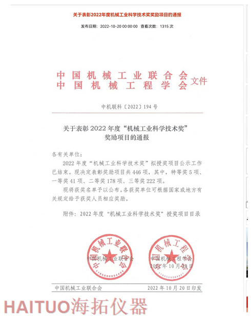海拓儀器榮獲2022年度中國機械工業(yè)科學技術獎?ICC訊?10月20日,2022年度“中國機械工業(yè)科學技術獎”項目名錄正式發(fā)布,由海拓儀器(江蘇)有限公司完成的“超快速冷熱沖擊試驗系統(tǒng)關鍵技術研究與系列應用”項目榮獲2022年度“中國機械工業(yè)科學技術獎”三等獎。??據(jù)了解,中國機械工業(yè)科學技術獎是根據(jù)《國家科學技術獎勵條例》和《社會力量設立科學技術獎管理辦法》的有關規(guī)定,由中國機械工業(yè)聯(lián)合會和中國機械工程學會共同設立并經(jīng)國家科學技術部批準,在國家科技獎勵主管部門登記的面向全國機械行業(yè)的綜合性科技獎項。旨在表彰在機械工業(yè)科技工作中作出突出貢獻的單位和人員,獎勵范圍包括:機械工業(yè)科學技術發(fā)明成果、機械工業(yè)科學技術進步成果、機械工業(yè)工程化和新技術推廣成果和機械工業(yè)軟科學和標準成果。??海拓儀器是一家集研發(fā)、制造、貿(mào)易于一體高科技現(xiàn)代化公司,公司成立于2005年,主要產(chǎn)品包括:超快速冷熱沖擊試驗機(熱流儀)、快速溫變應力篩選試驗箱(ESS), -